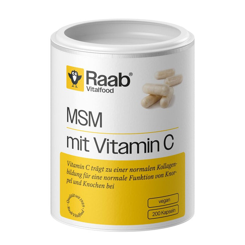 Raab reines MSM verbindet organisch gebundenen Schwefel mit natürlichem Vitamin C aus der Acerolakirsche. MSM ist die Abkürzung für eine organische Schwefelverbindung, die auch natürlicherweise in tierischen und pflanzlichen Organismen vorkommt und somit in geringen Mengen Bestandteil der menschlichen Ernährung ist. Das enthaltene Vitamin C trägt zu einer normalen Kollagenbildung für eine normale Knorpelfunktion und für eine normale Funktion der Knochen bei. Inhalt: 200 Stück Kapseln