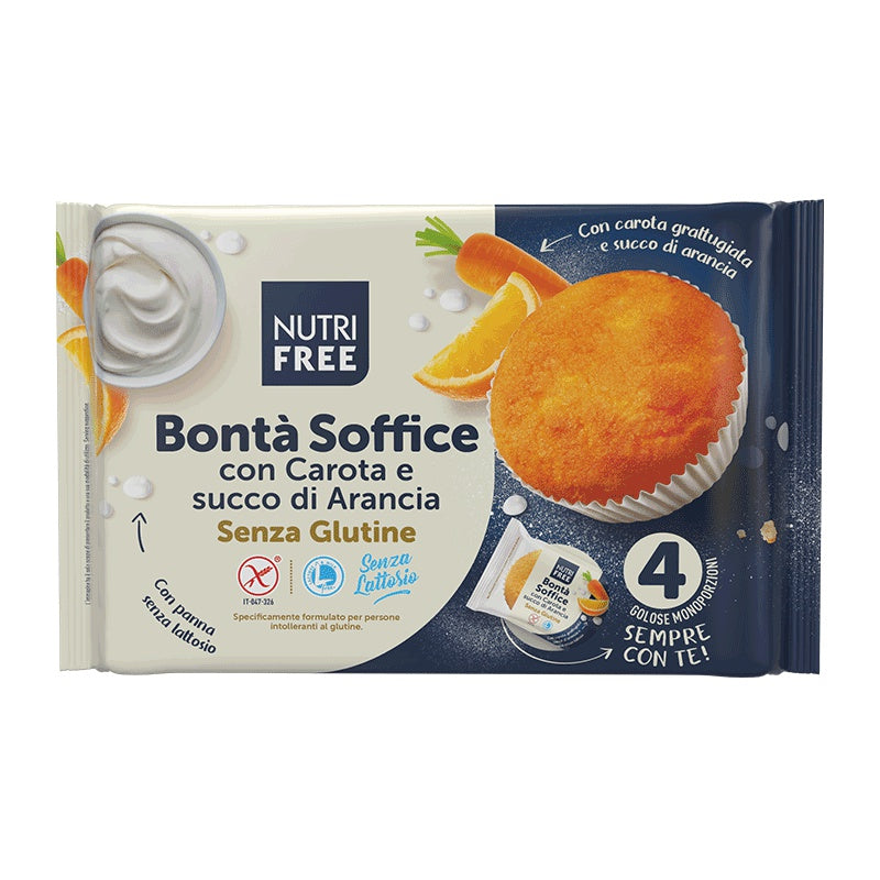 Nutri Free Bonta Soffice glutenfrei Kuchen Karotte Orange aus dem italienischen Hause Nutri Free. Köstliche kleiner Muffin Kuchen in 4 einzeln verpackten Portionen. Soft Goodness mit Karotten-Orangensaft ist die perfekte Wahl für alle, die einen leckeren und unkomplizierten Snack suchen – ideal für jede Tageszeit. Ein einfaches, aber dennoch verlockendes Rezept mit geriebenen Karotten, Orangensaft und laktosefreier Sahne für eine einzigartige Kombination und ein unwiderstehliches Geschmackserlebnis.