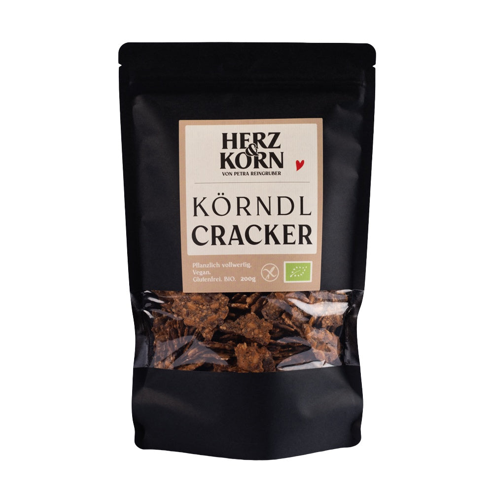 Herz&Korn Körndl Cracker glutenfrei von Petra Reingruber. Das Produkt bringt Dir das Beste aus der Natur, knusprig gebacken, pflanzlich vollwertig und perfekt für den kleinen Hunger zwischendurch. BIO-Qualität. Vegan.