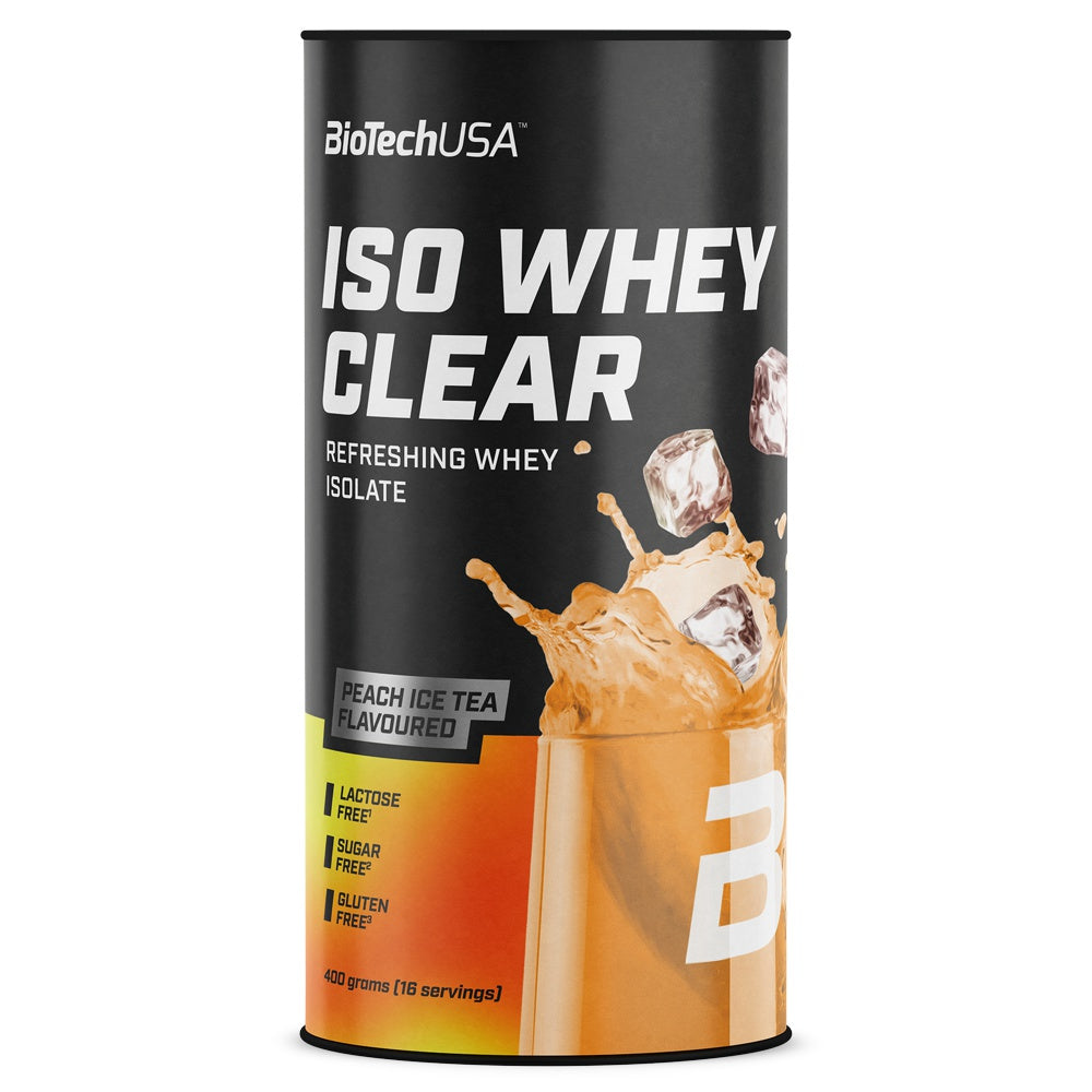 BioTechUSA Iso Whey Zero Clear Peach Ice Tea erfrischendes Protein Getränkepulver glutenfrei. Iso Whey Zero Clear ist ein absoluter Volltreffer, wenn dir der Sinn nicht nach einem cremigeren Protein-Shake, sondern nach einem wirklich erfrischenden Getränk steht! Die Basis des Produkts ist nämlich nichts anderes als ein spezielles Molkeneiweiß-Isolat, dem es zu verdanken ist, dass das Eiweißgetränkepulver nicht die übliche cremige Konsistenz aufweist, sondern einem klaren, leichten Erfrischungsgetränk ähnelt. Und so erhältst du außer der angenehmen Konsistenz auch die von anderen Iso Whey Zero Produkten gewohnte hohe Qualität! Hoher Proteingehalt, Glutenfrei und Laktosefrei (Laktosefrei bezieht sich auf das in Wasser gelöste, gebrauchsfertige Produkt. Laktosefrei: <0,1 g Laktose/100 ml im gebrauchsfertigen Getränk.)