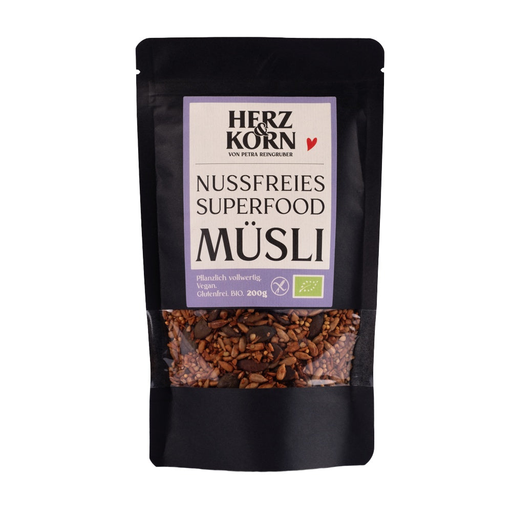 Herz&Korn Nussfreies Superfood Müsli glutenfrei von Petra Reingruber. Das Produkt bringt Dir das Beste aus der Natur, vollgepackt mit heimischen Superfoods und Energie für Deine Tag, und alles Nussfrei und in BIO-Qualität. Vegan.